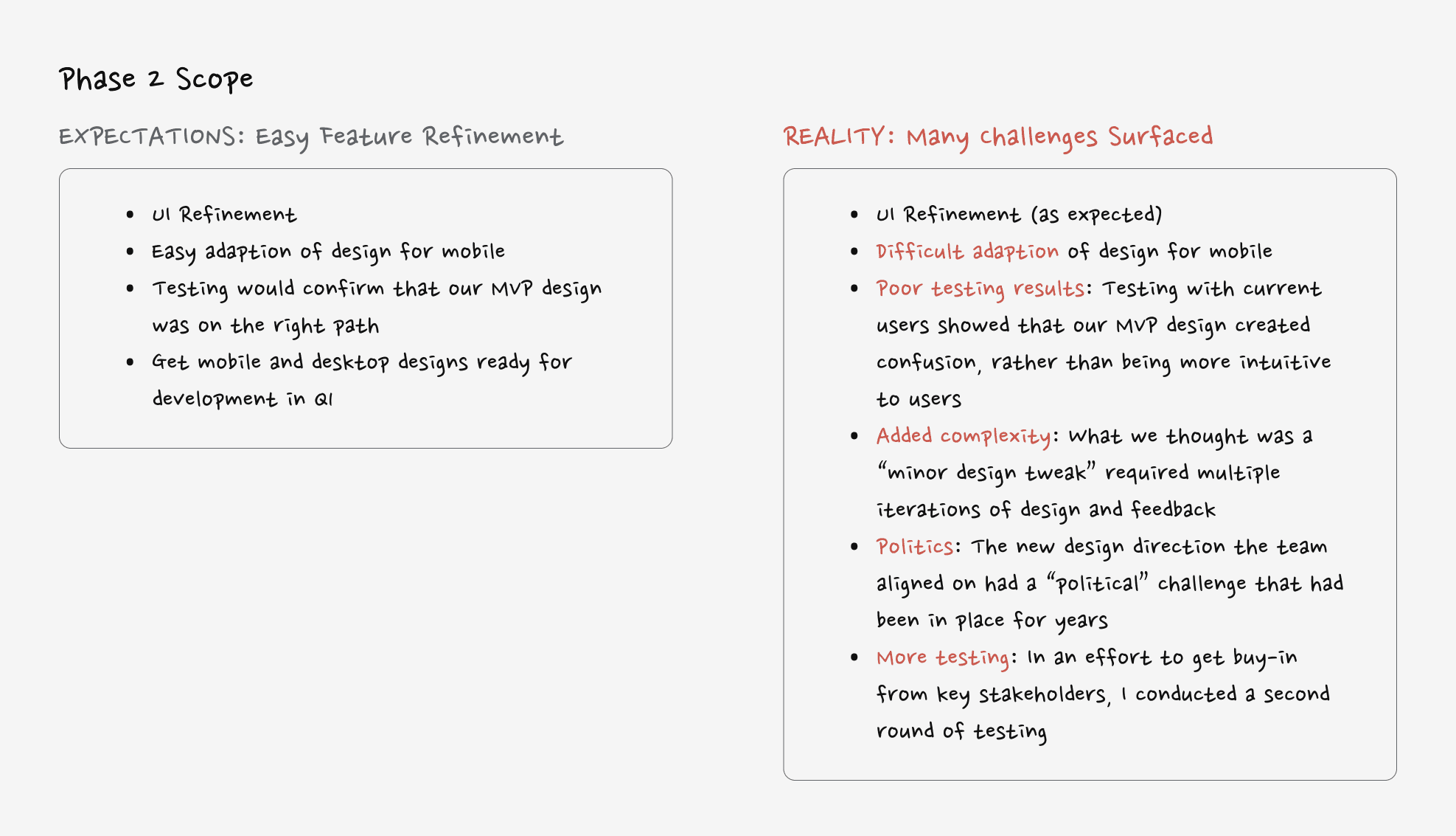 What started as an MVP project quickly evolved into a more ambitious, long-term solution. Through user research, testing, and collaboration with stakeholders, I uncovered deeper usability challenges and helped realign the design to better meet both user needs and business goals. Along the way, I secured key stakeholder buy-in, with a second round of feedback confirming the changes were heading in the right direction.