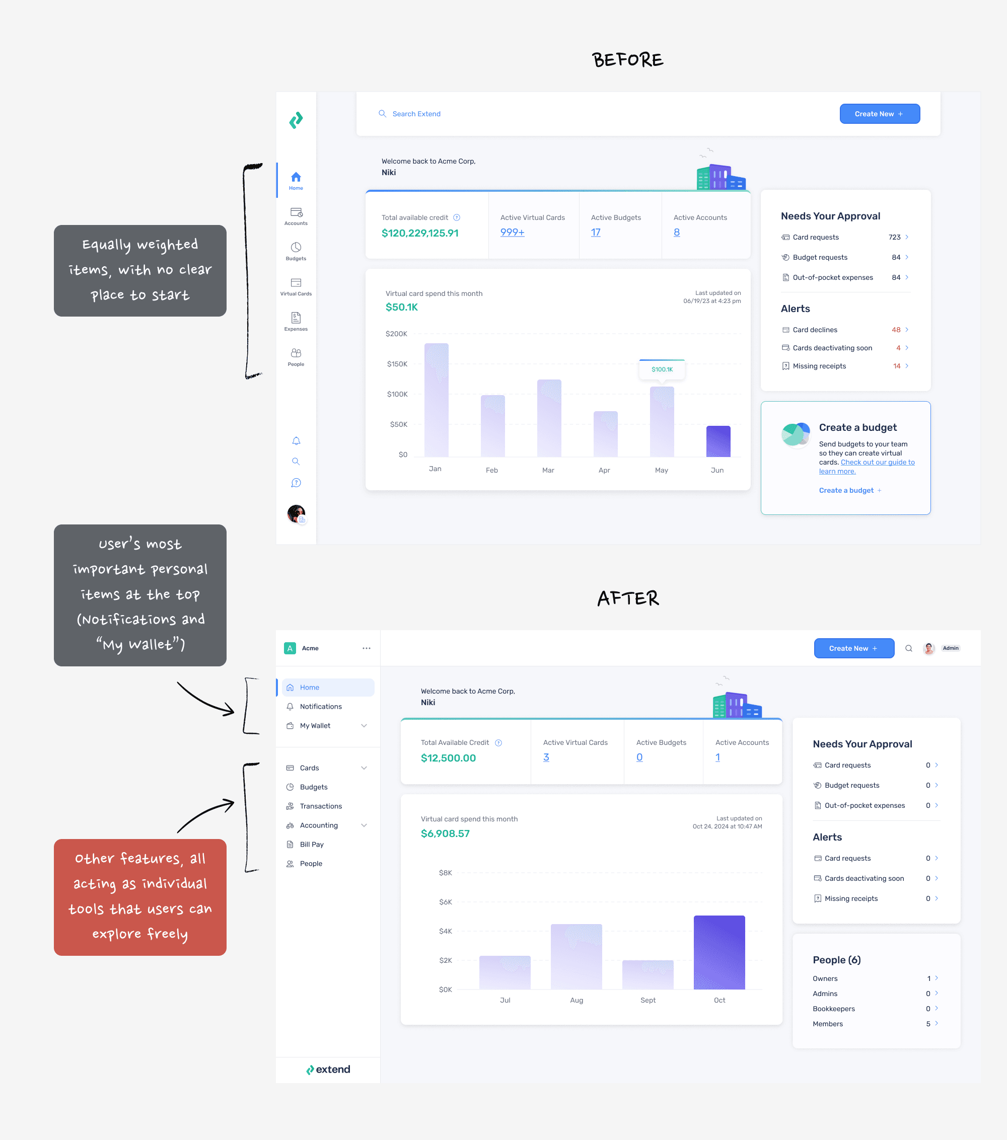 The new navigation clears up confusion, smooths out the user experience across web and mobile, and sets the stage for Extend to grow into a spend management platform. It’s all about keeping current users happy and showing them why Extend’s paid features are worth it.
