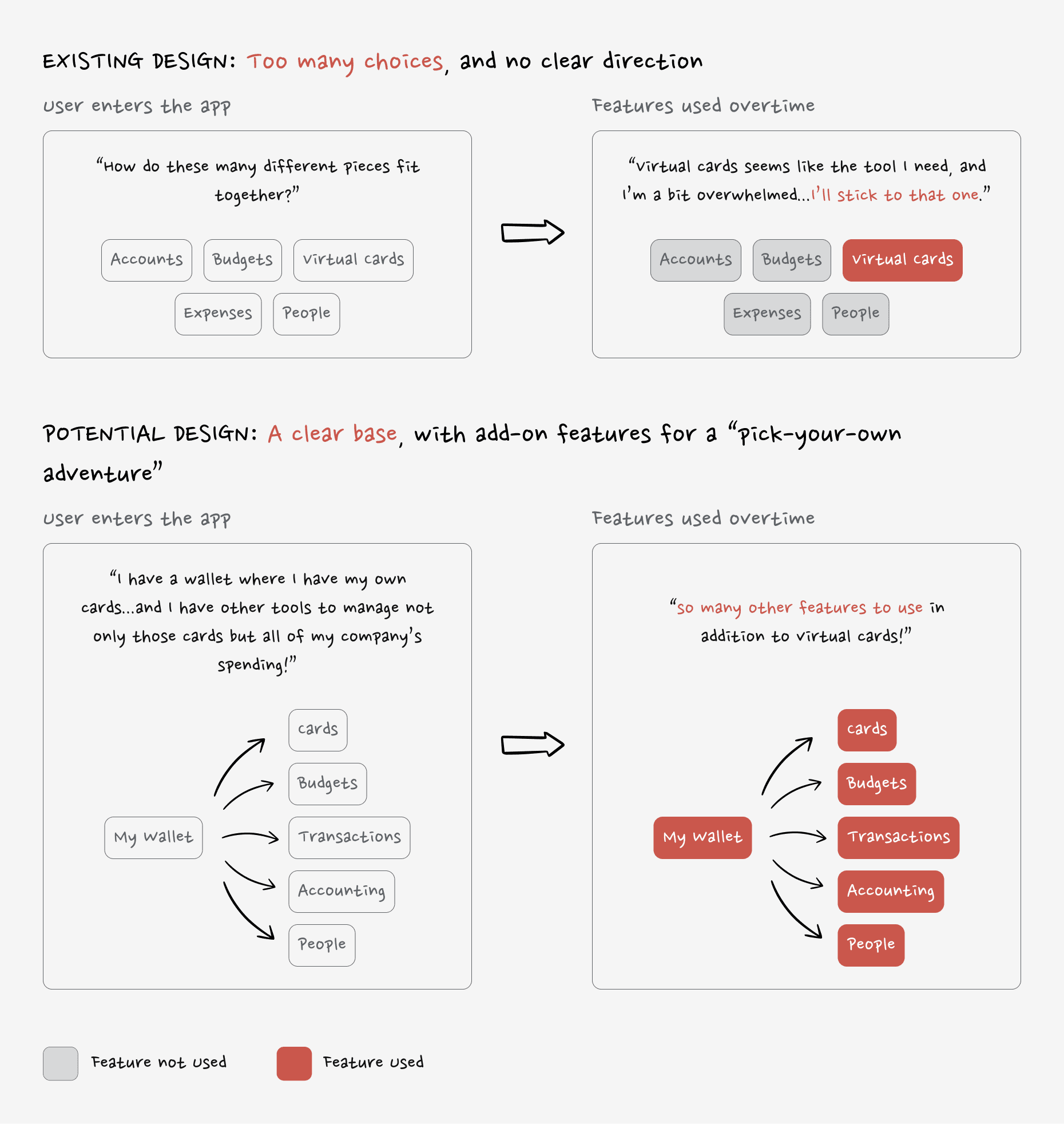 The company wanted to charge users for these paid features while keeping the virtual card tools free. Unfortunately, the navigation didn’t make the expense management features obvious, and many users were unaware of the full potential of the platform.