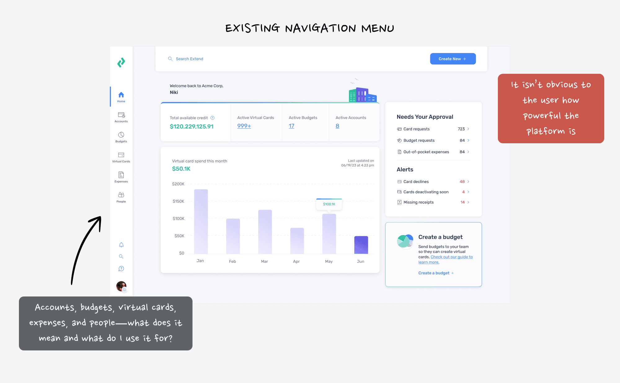 Extend’s current navigation structure mainly highlighted virtual card creation, which was great for initial user acquisition. But as the platform grew, the navigation failed to showcase its full suite of expense management tools.