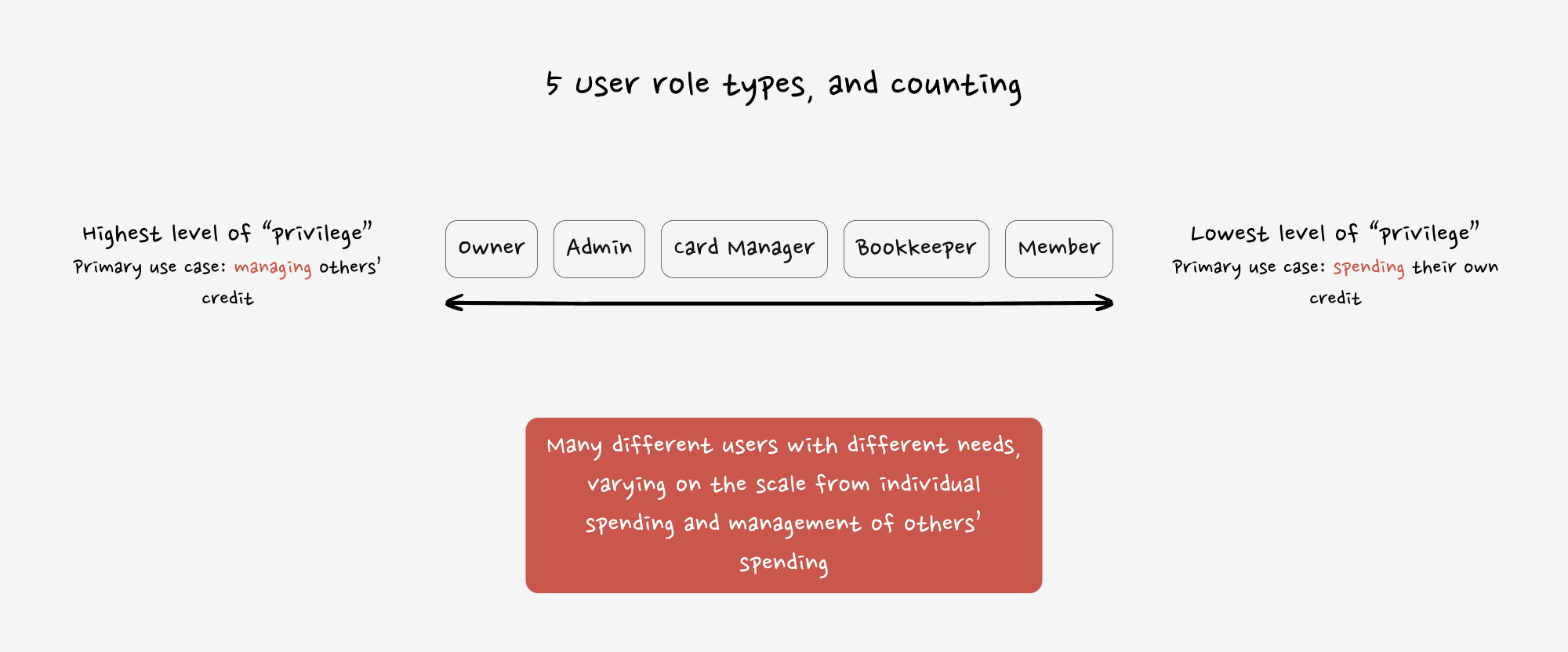 The users of Extend are as diverse as the businesses they represent. Internally, the product and design teams are active users of the platform, ensuring that all decisions are closely aligned with real-world needs. Externally, employees of SMBs across various roles (owners, admins, bookkeepers, etc.) use the platform, which created a challenge: different users had different needs, and many didn’t even have the correct roles assigned within the system.